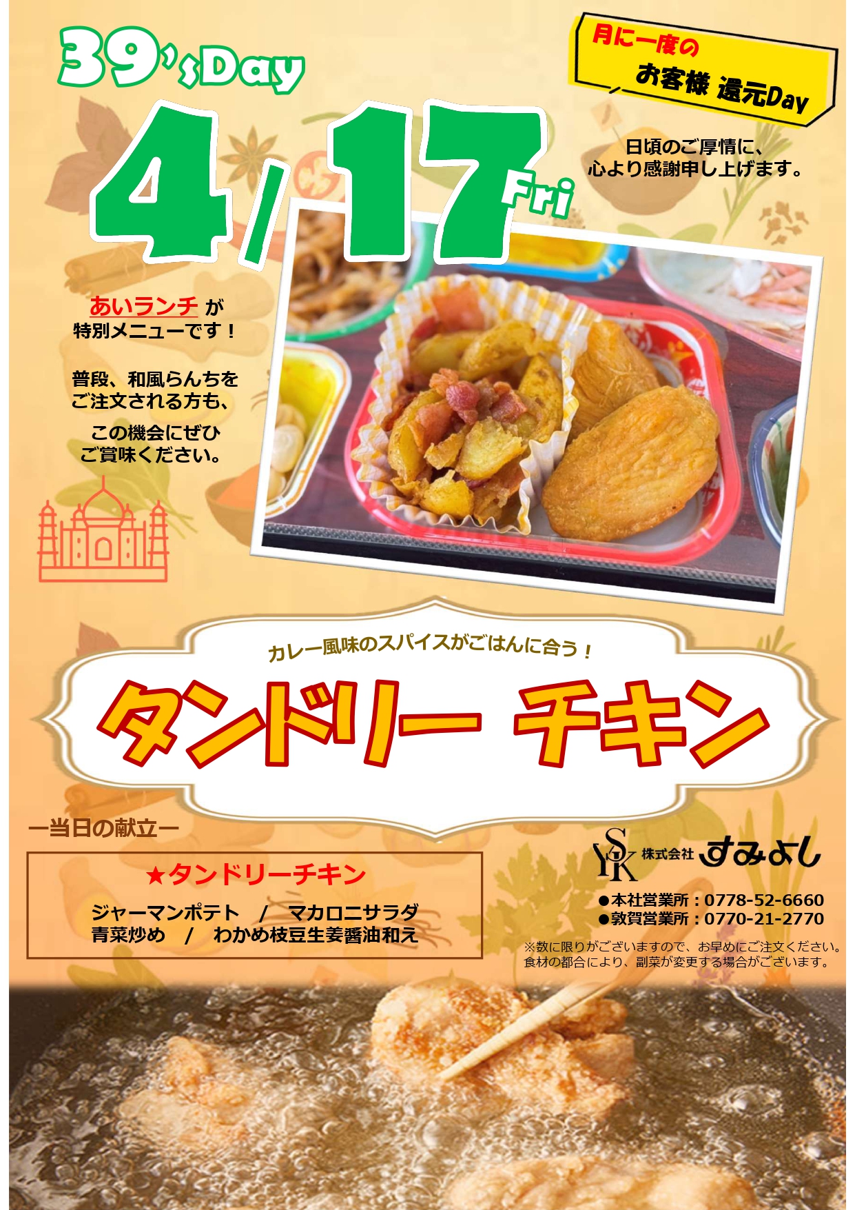 今回はあいランチ・スペシャルランチに「タンドリーチキン」が入ります!